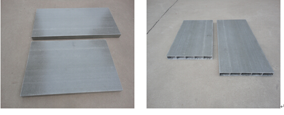 該產品是由不飽和聚酯樹脂、阻燃劑、玻璃纖維無捻粗紗、玻璃纖維縫編織物、色料、相關填料等復合后一次性整體拉擠制成。其結構是由上下兩個橫板面、中間六個豎板面構成的五個連續空心腔體組成的整塊蓋板,簡稱空心蓋板。樣品圖示: