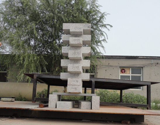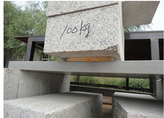 下面圖片是溝蓋板在做靜載試驗時的狀況。試塊總重量為1100公斤,樣品為長度1米的溝蓋板。兩端支撐面各長100毫米,試壓點在溝蓋板中心200毫米范圍,底部壓有一木板寬200毫米(上圖為整體圖,下圖為底部木板放大圖)。試驗首日溝蓋板中心下沉2毫米,也就是撓度2毫米。連續靜壓第30天時,中心下降度即撓度不變仍為2毫米。