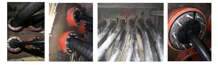 安裝時(shí)將封堵器初步裝配在一起,套在電纜上并將它推入電纜管內(nèi)合適位置后,將螺栓均衡逐步緊固到位即可。緊固時(shí)需用套筒扳手緊固,若有條件*好使用電動(dòng)套筒扳手緊固。如果封堵器與電纜或與電纜管之間縫隙較大時(shí),可加膠帶纏繞解決或使用密封膠解決。該產(chǎn)品的特點(diǎn)也是安裝方便、密封可靠和成本較低。工程案例如下:
