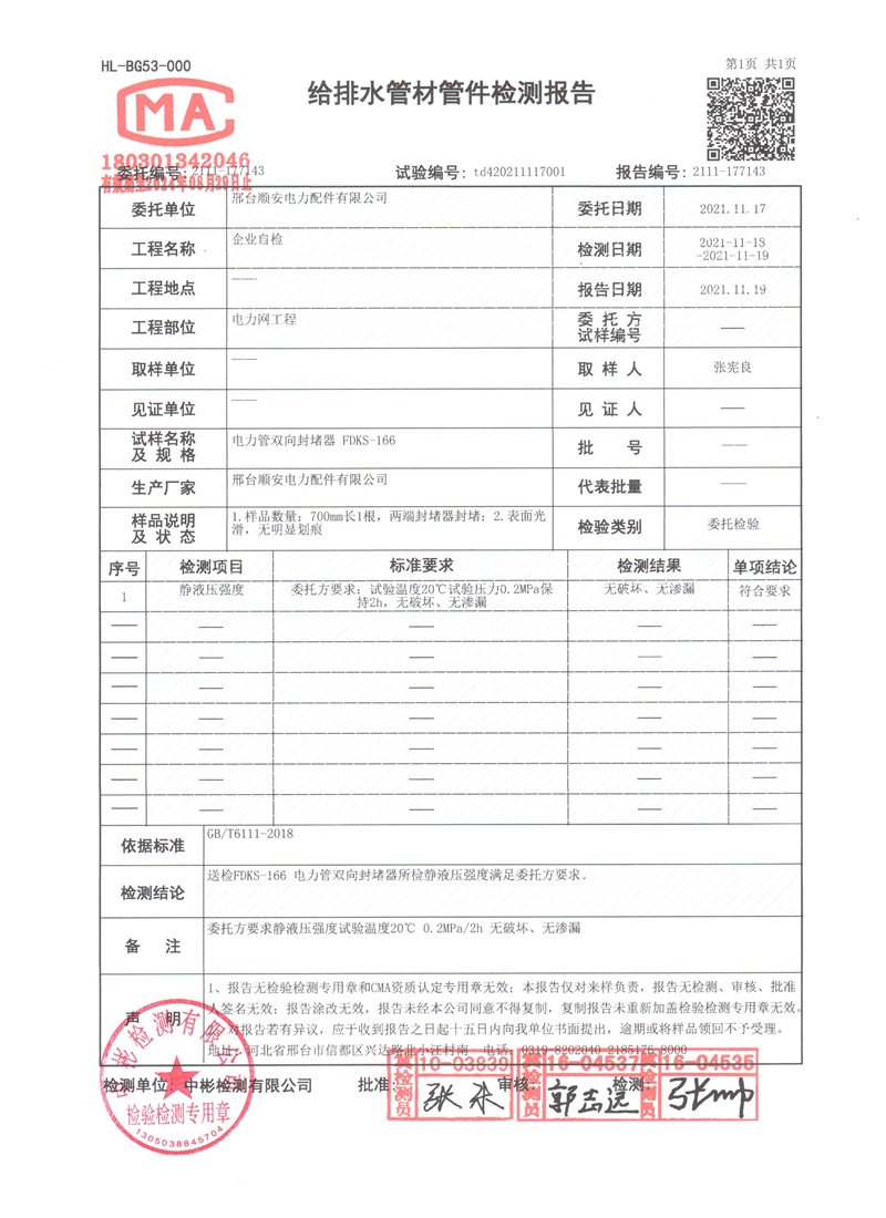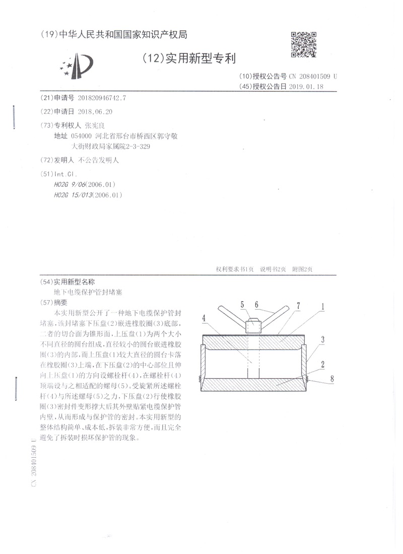 為了滿足電力管對封堵器的質量要求,我公司在2018年研發成功了電纜空管單向封堵器和雙向封堵器,并于2019年獲得了專利證書(見專利證書附件)。經過3年以來的不斷改進和完善,現已成功投放市場。同時將雙向封堵器FDKS-166型送國家權威機構進行了耐水壓檢驗,經受了20米高水壓檢驗,也就是六、七層住宅樓房高度的水壓檢驗(見水壓檢驗報告)。