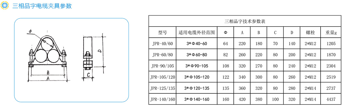 我公司電纜夾具共有三大類,分別是復合材料電纜夾具、單相鋁合金電纜夾具(抱箍)和接地電纜夾具。目前單相電纜夾具有16種、三相品字電纜夾具有6種。照 片及參數表如下: