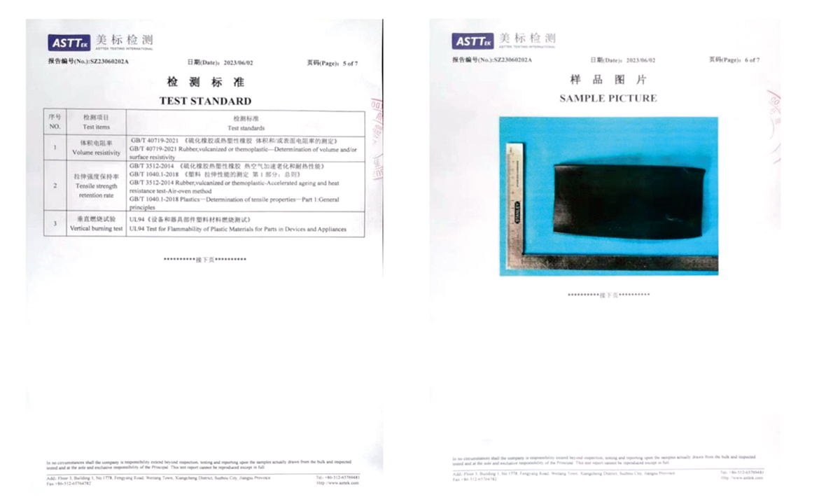 一、橡膠墊及表面電阻測試照片如下,左一是半導電橡膠墊,中間是表面電阻測試儀顯示電阻為10的4次方,右一是表面電阻測試儀帶包裝說明時的測試結果電阻也是10的4次方。